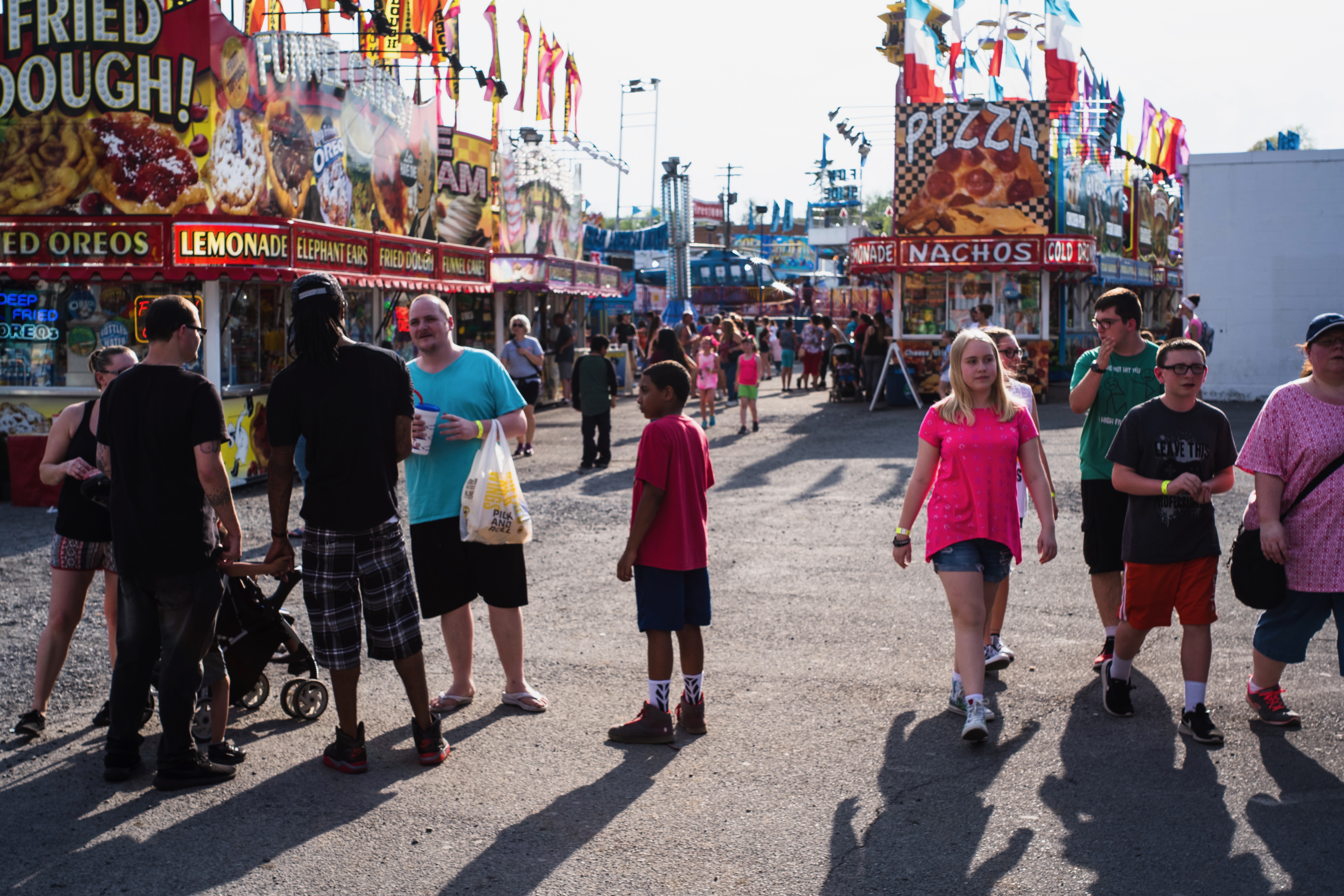 The photograph captures a bustling fair scene, filled with a diverse crowd enjoying various food stalls adorned with colorful banners. Bright sunlight casts long shadows on the ground, enhancing the lively ambiance while families and friends engage in cheerful conversation and exploration. The composition draws the viewer's eye through the core of the festival, conveying a sense of joy and community.