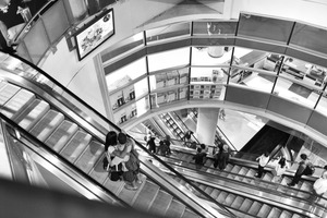 In a bustling escalator, a couple shares a tender embrace, standing out against a dynamic flow of shoppers around them. The composition captures a contrast of intimacy and the busy environment, enhanced by the stark black-and-white tones that evoke a sense of timelessness. The sweeping lines of the escalator and the surrounding architecture draw the eye, creating a harmonious blend of connection and chaos.