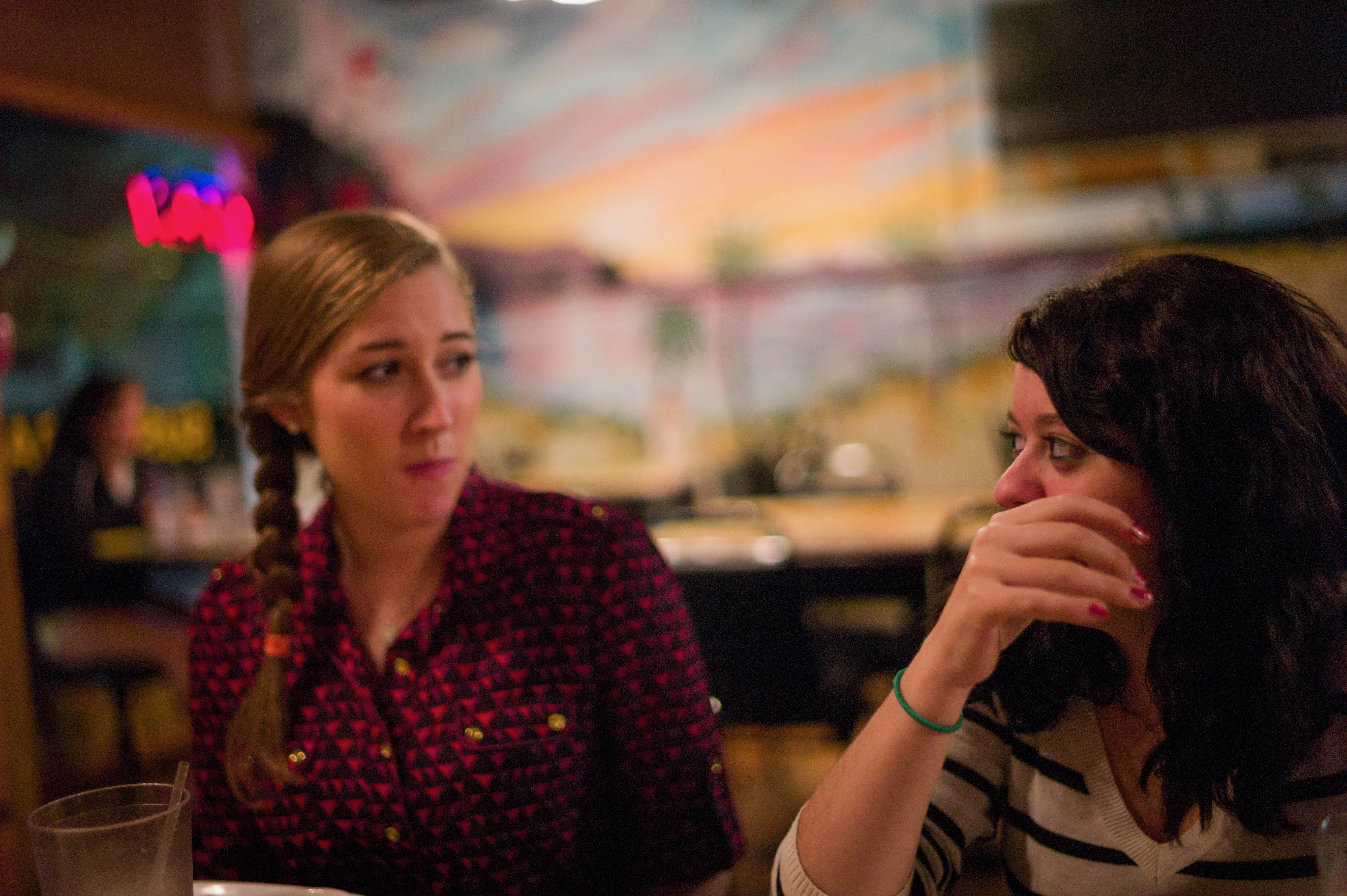 In a warmly lit diner, two young women engage in a moment of quiet exchange, their expressions revealing a mix of contemplation and curiosity. The soft background glow adds a nostalgic warmth to the scene, contrasting with the slight tension in their body language. The vibrant mural behind them hints at a spirited atmosphere, yet their focus remains solely on each other, creating an intimate bubble amidst the casual setting.