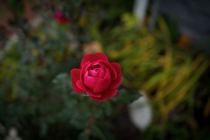 A striking red rose emerges among a blur of green and yellow foliage, drawing the viewer's focus with its vibrant color and delicate petals. The softly diffused lighting enhances the flower's romantic allure, evoking a sense of tranquility and beauty in nature. The composition, centered on the rose, creates an intimate moment that invites appreciation for its intricate details.