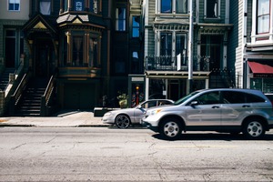 The photograph captures a vibrant street scene, showcasing a row of vintage and modern architectural styles. With a dynamic sense of movement, speeding cars blur past the quaint houses, while the warm sunlight casts gentle shadows, creating a contrast between the bustling activity and the serene presence of the homes. The composition emphasizes the interplay of urban life and historic charm, evoking a sense of energy and nostalgia.