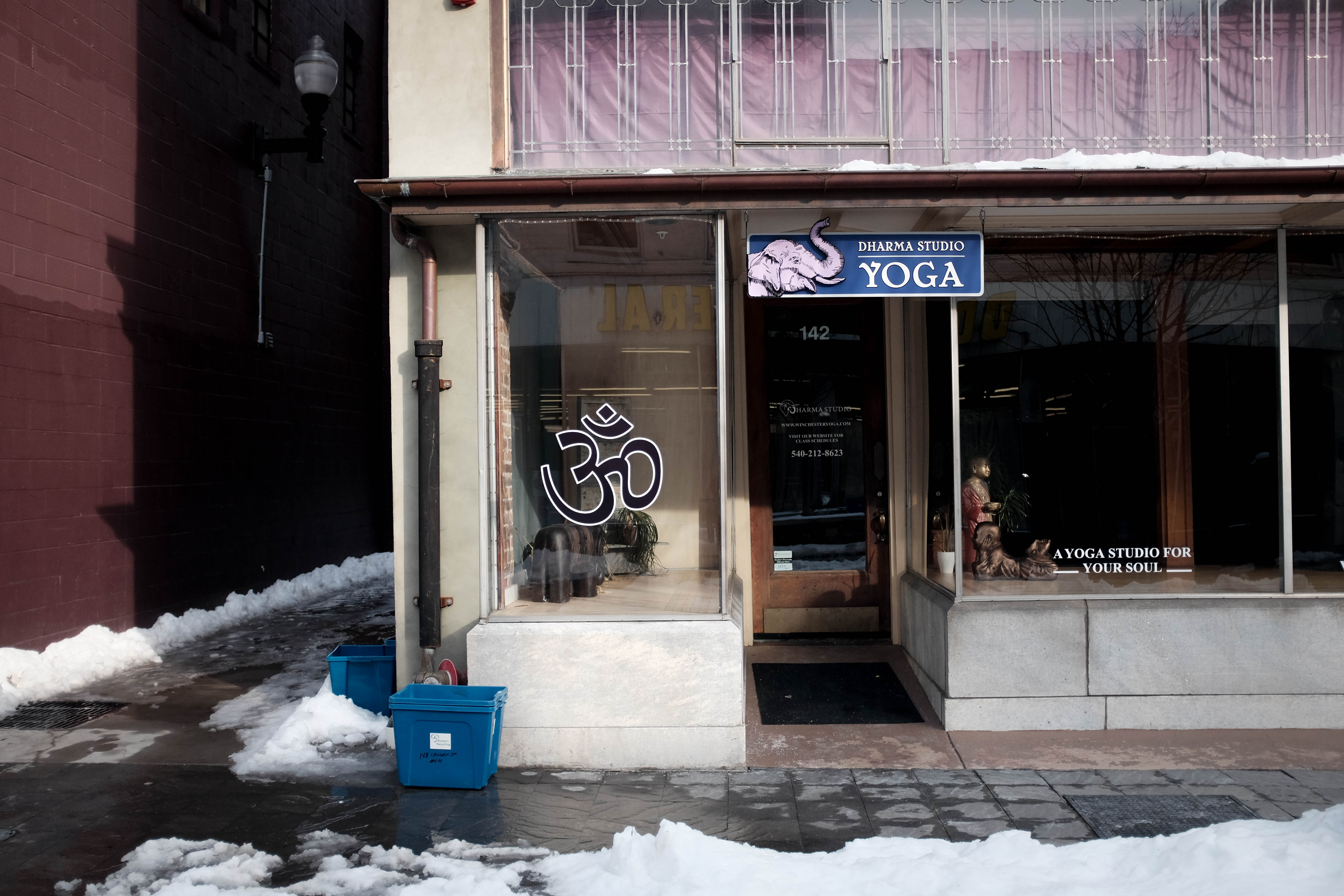 The photograph captures the serene exterior of a yoga studio, framed by soft winter light illuminating the signage and window display. Snow blankets the ground, adding a peaceful depth to the scene, while the contrasting colors of the walls create a harmonious yet lively atmosphere. The presence of yoga symbols invites a sense of calm and introspection, enhancing the studio's welcoming allure.