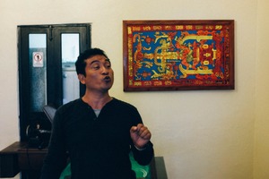 The photograph captures a man passionately speaking, exuding energy and engagement. He stands against a vibrant, intricately designed wall hanging that adds a cultural richness to the scene, while warm, soft lighting creates an inviting atmosphere. The man’s animated expression and lively posture contrast with the calm background, emphasizing his role as the focal point of the composition.