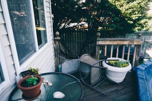 This photograph captures a serene and somewhat neglected patio space, where empty lounge chairs lean against a wooden railing. The soft, natural light filters through the surrounding greenery, creating a tranquil and contemplative mood, as potted plants hint at past care and attention. The composition emphasizes the juxtaposition between nature and human presence, evoking a sense of peaceful solitude.