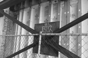 This monochrome photograph captures the stark contrast of construction elements intertwined with a whimsical chalk drawing. A chain-link fence divides the frame, while pointed structural beams create dynamic lines that guide the viewer’s gaze. The play of light and shadows enhances the gritty mood, evoking a sense of transient beauty amidst urban decay.