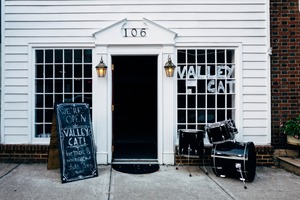 The photograph captures the inviting entrance of 'Valley Cat,' a lively music venue. With warm, inviting lighting illuminating the doorway and a playful chalkboard sign featuring live music events, the scene conveys a sense of community and excitement. The scattered drums hint at the vibrant musical atmosphere awaiting inside, enhancing the inviting mood.