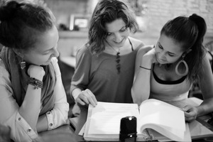 In this intimate black-and-white scene, three women are absorbed in a shared moment, poring over a document with expressions of curiosity and delight. The soft lighting highlights their features and the textures of their clothing, creating a warm, inviting atmosphere that suggests camaraderie and intellectual engagement. The blurred background hints at a cozy environment, enhancing the focus on their collaborative spirit.