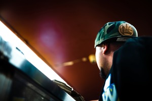 This photograph captures a man wearing a camo cap, seen from a low angle, immersed in a dynamic urban environment. The moody lighting creates a dramatic contrast, with soft highlights against a warm, muted background that evokes a sense of contemplation and focus. The composition draws the eye upward towards light, suggesting aspiration amidst the everyday hustle.
