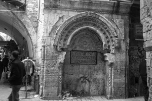 This photograph captures an intricately designed archway nestled in a bustling alley, exuding a sense of history and culture. The stark black-and-white tones heighten the mood, adding a timeless quality to the weathered stone and ornate inscriptions. Shadows play across the scene, enhancing the contrast between the ancient structure and the everyday life of passersby, evoking a feeling of lingering stories within the marketplace.