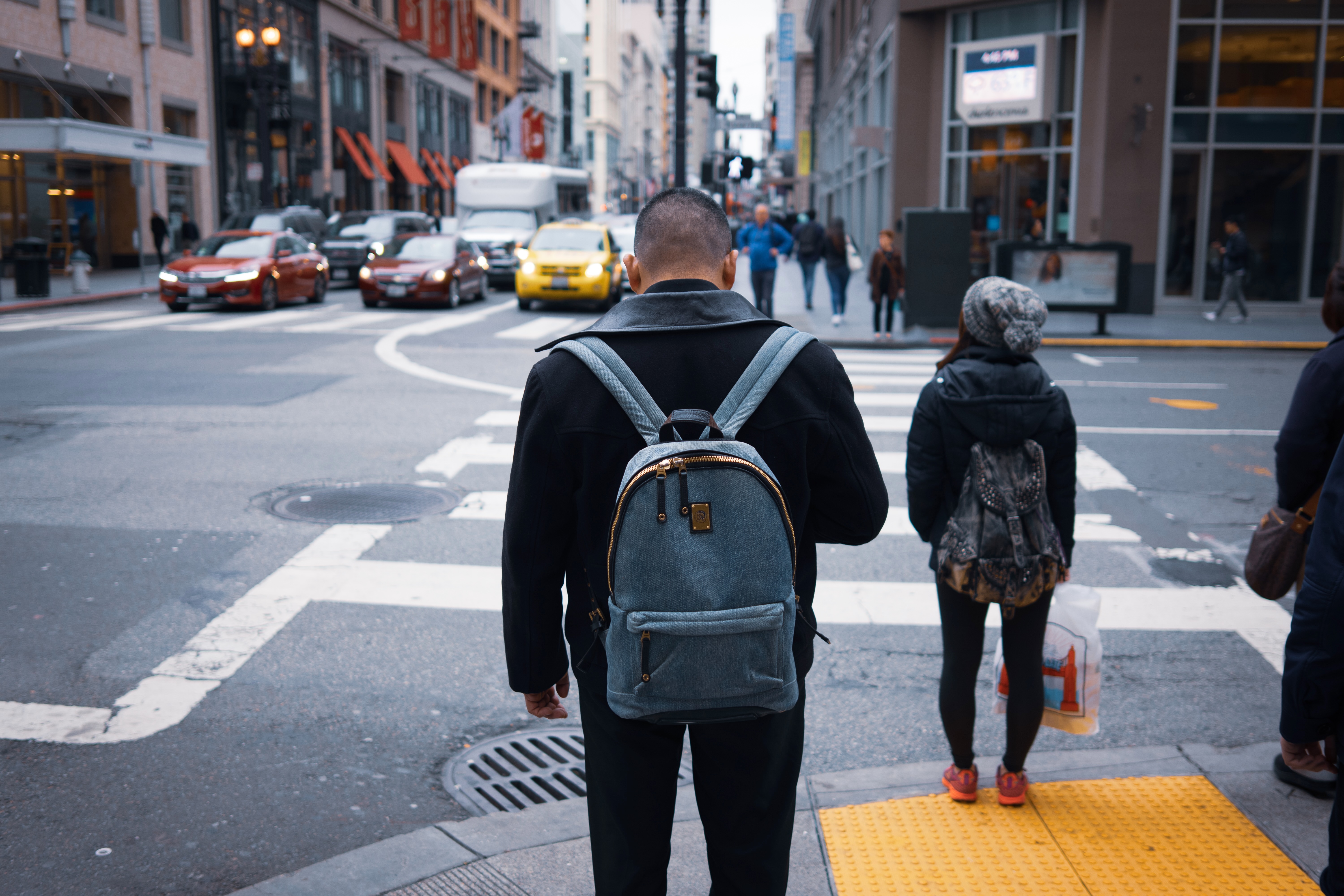 A solitary figure stands at a bustling crosswalk, backpack slung casually over one shoulder, embodying a moment of pause amid the city's hustle. The cool, muted tones and overcast sky create a contemplative mood, contrasting with the vibrant hints of yellow from passing taxis and the warm glow of street lamps. This composition captures the essence of urban life—the interplay between solitude and the surrounding crowd.