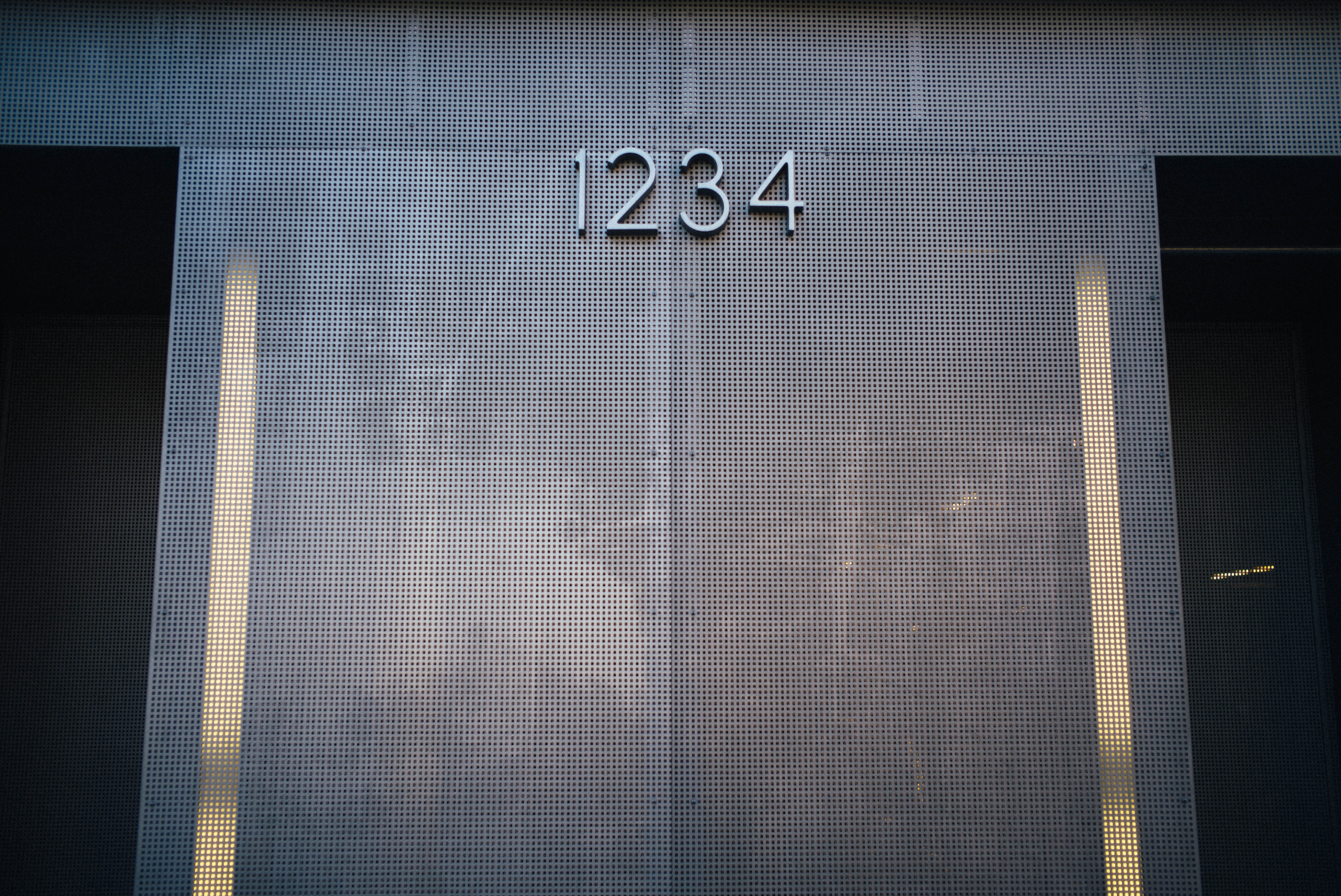 This photograph captures the sleek facade of a modern building, prominently featuring the number '1234' in brushed metal against a textured surface. Shadows and subtle light play across the design, creating a tranquil yet sophisticated mood that emphasizes architectural simplicity. The composition is balanced and intentional, drawing the viewer's eye to the numeric detail amidst an understated background.