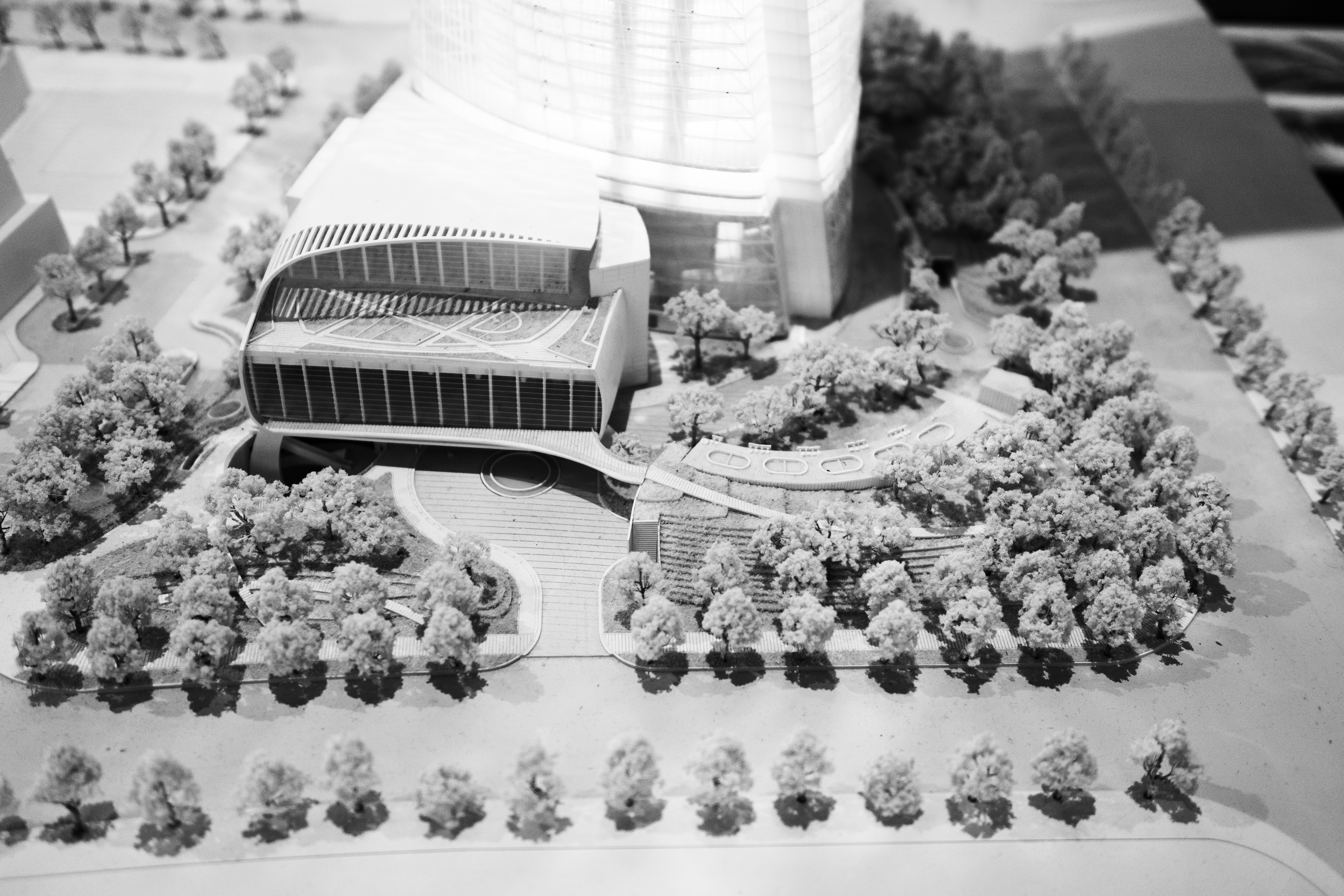 The photograph captures a detailed architectural model, rendered in black and white, showcasing a modern building and its surrounding landscape. The composition highlights the intricate design of the structure alongside meticulously arranged miniature trees, conveying a sense of tranquility and foresight. The soft lighting enhances the textures and curves, adding a dreamlike quality to the model's contours and shadows.