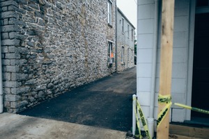 The photograph captures a narrow, paved alley flanked by weathered stone walls, suggesting a blend of history and urban life. The muted lighting casts a subdued atmosphere, enhancing the feeling of solitude and quiet anticipation. Striking yellow caution tape hints at ongoing construction, adding an element of intrigue and transition to the scene.