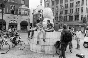 In a bustling city square, a group of young individuals lounges on a large abstract sculpture, embodying a casual and playful atmosphere. The black and white composition accentuates the contrasts between the boys' relaxed postures and the surrounding urban activity, evoking a sense of camaraderie amid the city's vibrancy. Dim lighting subtly enhances the focus on the figures, highlighting their expressions and interactions as they enjoy a moment of togetherness.