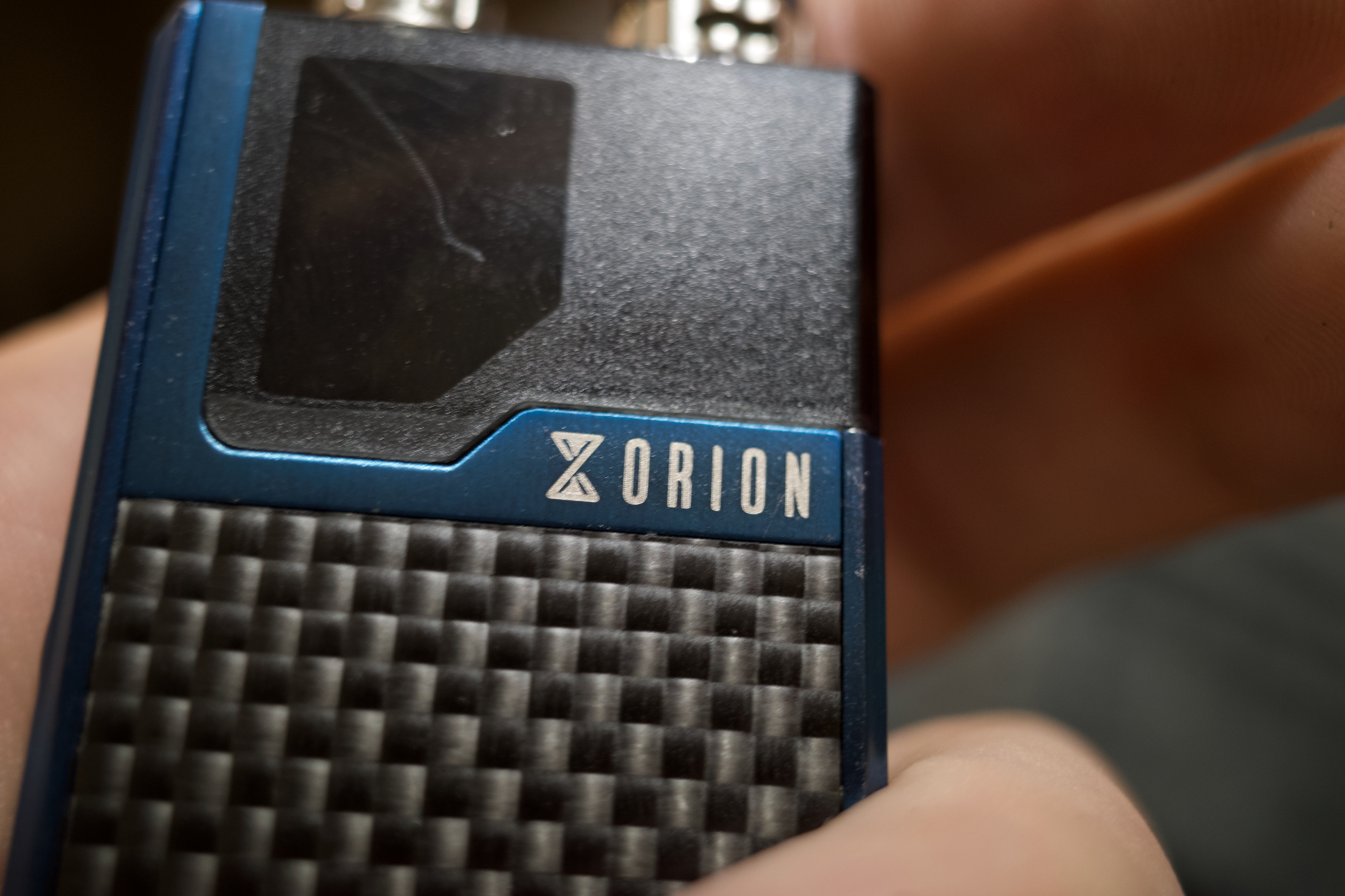 This close-up photograph captures a handheld electronic device, prominently displaying the brand 'Orion.' The mood is sleek and modern, with soft, diffused lighting emphasizing the device's polished surfaces and textured grip, evoking a sense of intimacy and personal connection.