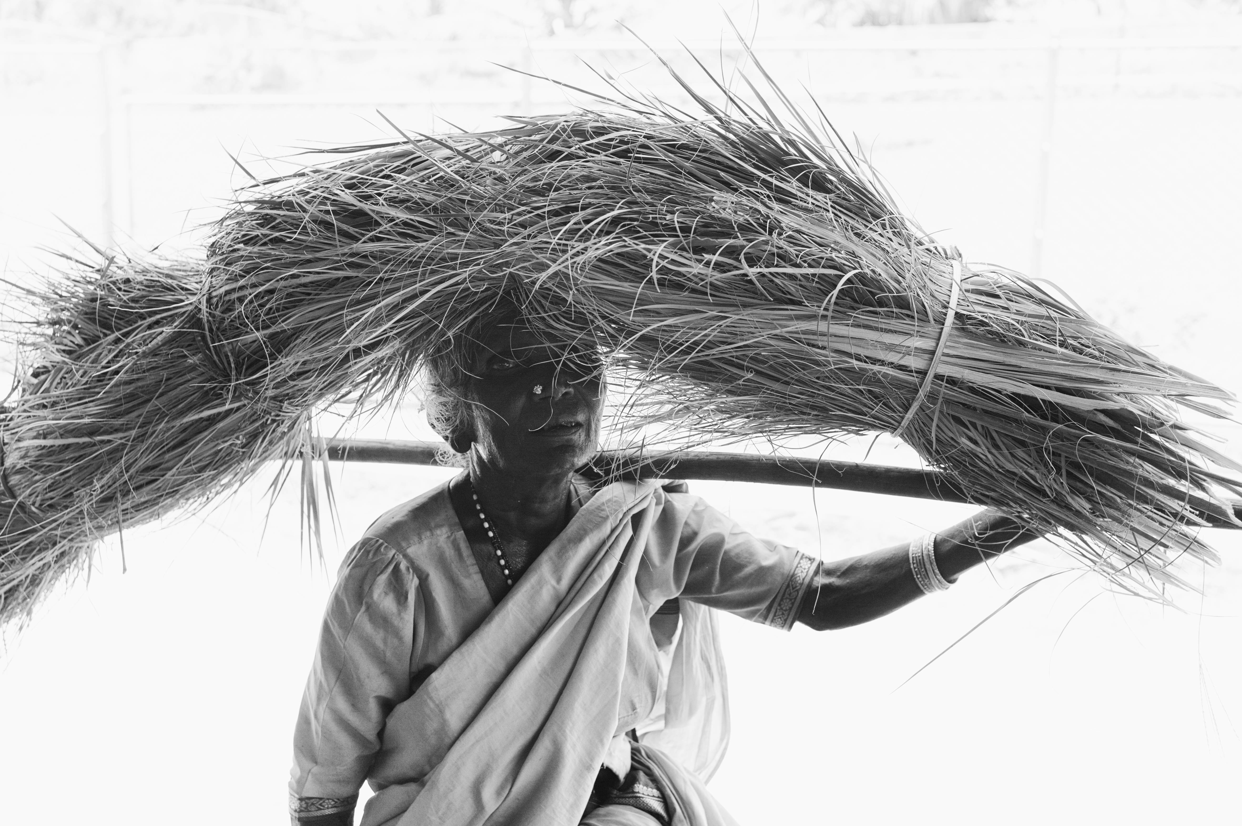 The photograph captures an elderly woman draped in a light sari, balancing a bundle of grass on her head, embodying strength and endurance. The stark black-and-white palette accentuates her weathered features and the intricate textures of the grass, creating a poignant contrast against the soft, blurred background. The natural light bathes the scene, enhancing the somber yet uplifting mood that conveys a story of hard work and solitude.