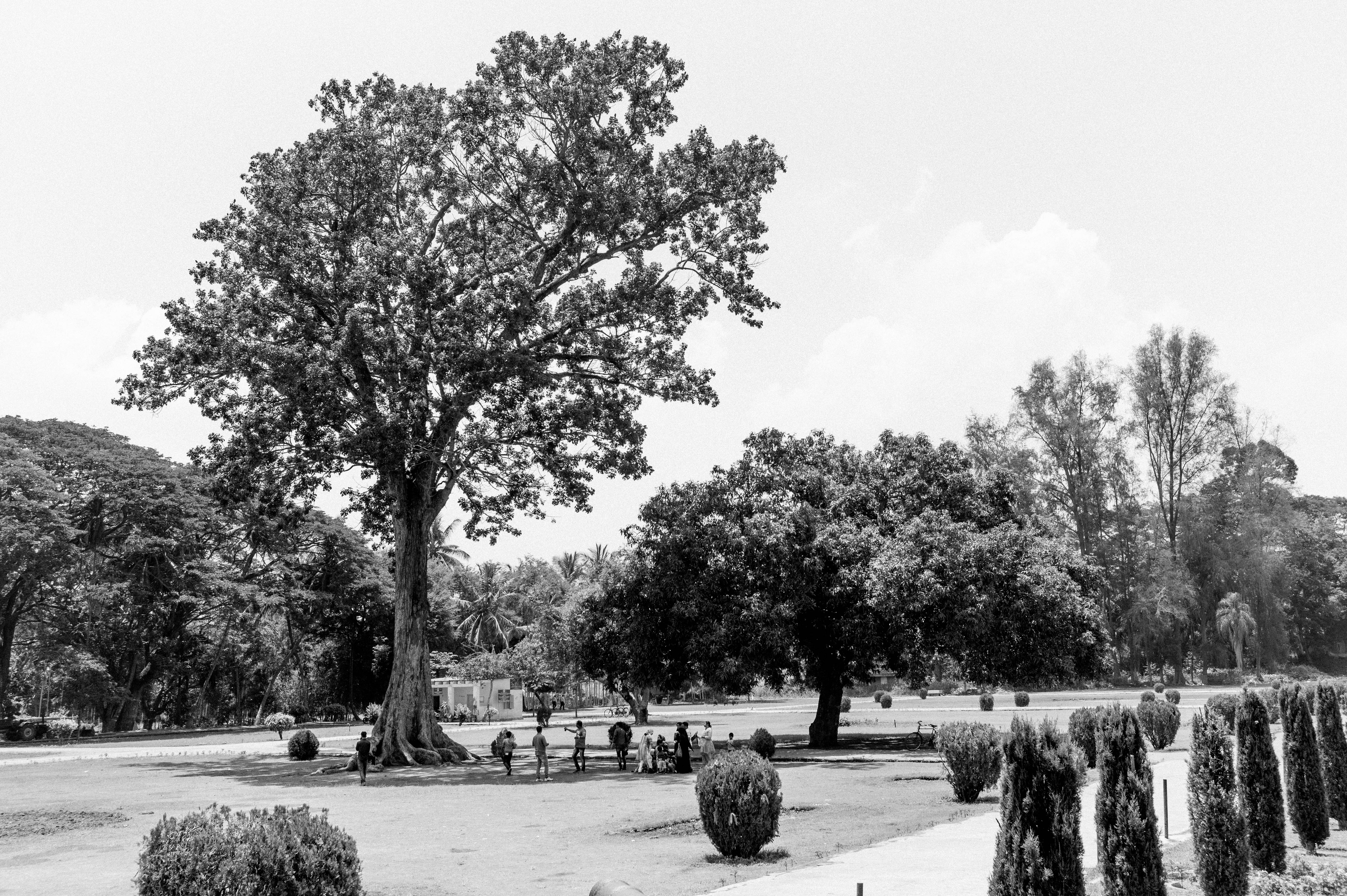 This black-and-white photograph captures an expansive park setting dominated by a majestic tree, its branches sprawling wide and casting intricate shadows. The mood is serene and contemplative, punctuated by the presence of a small group of figures engaged in quiet activity, emphasizing a connection to nature. Soft summer light bathes the scene, highlighting the textures of the foliage and the gentle curves of manicured bushes in the foreground.