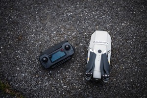 A drone rests on a textured asphalt surface next to its sleek black remote control. The muted colors and overcast lighting create a calm, contemplative mood, suggesting a moment of pause before flight. The composition draws the eye to the contrast between the technology and the rugged ground, highlighting the union of innovation and nature.