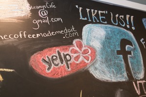 This photograph captures a chalkboard wall adorned with colorful social media logos and contact information, creating an inviting and casual atmosphere. The warm lighting enhances the chalk textures, highlighting the informal yet vibrant mood of the cafe space. The playful arrangement of text and imagery encourages a sense of community engagement and connection.