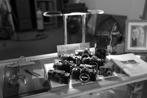 The photograph captures a cluttered display of vintage cameras illuminated by a soft, warm light. The black-and-white composition enhances the nostalgic mood, inviting viewers to reflect on the passage of time. Various camera models, accompanied by accessories and notes, create an intimate atmosphere, emphasizing the art of photography and the stories behind each device.