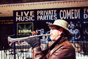 A seasoned musician passionately plays his trumpet against a vibrant, lively backdrop advertising live music and comedy. The warm sunlight casts a nostalgic glow, enhancing the intimate atmosphere of street performance. The musician's expressive demeanor and vintage attire evoke a sense of timeless artistry and connection to the spirit of music.