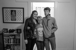 In this black-and-white photograph, three friends stand closely together, exuding warmth and camaraderie. The ambient lighting creates a cozy and inviting atmosphere, while the simple interior suggests an unguarded moment shared in a familiar space. Their smiles and relaxed poses highlight the essence of friendship, capturing a snapshot of joy and connection.