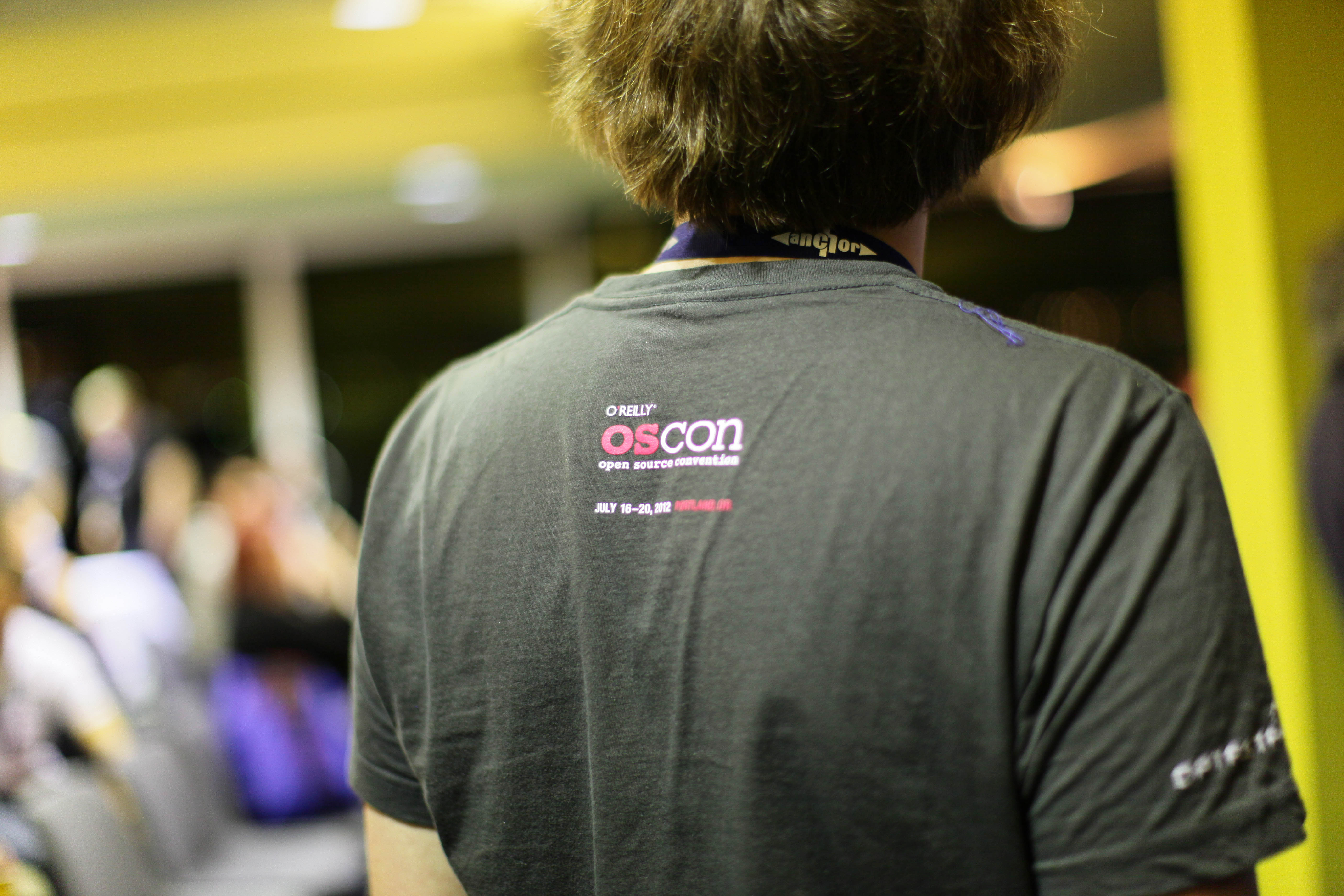 The photograph captures the back of a person wearing a dark t-shirt emblazoned with the logo of a tech conference, suggesting an atmosphere of community and networking. Soft, ambient lighting creates a warm mood, while the blurred figures in the background evoke a sense of shared experience at the event. The composition focuses on the shirt, emphasizing the themes of exploration and collaboration in the open-source community.