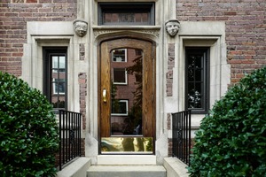 The photograph captures a striking entryway framed by stone and brick, showcasing a polished wooden door with golden accents. Lush greenery flanks the steps, enhancing a welcoming yet dignified mood. Soft natural light reflects off the door, inviting curiosity about what lies beyond.