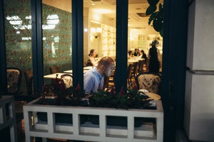 This photograph captures a solitary man engrossed in his work, illuminated by the soft glow of interior lighting. The warm ambiance contrasts the cool blue hues outside, creating a sense of introspection. Lush greenery in the foreground offers a natural frame, enhancing the peaceful yet busy atmosphere of the café setting.