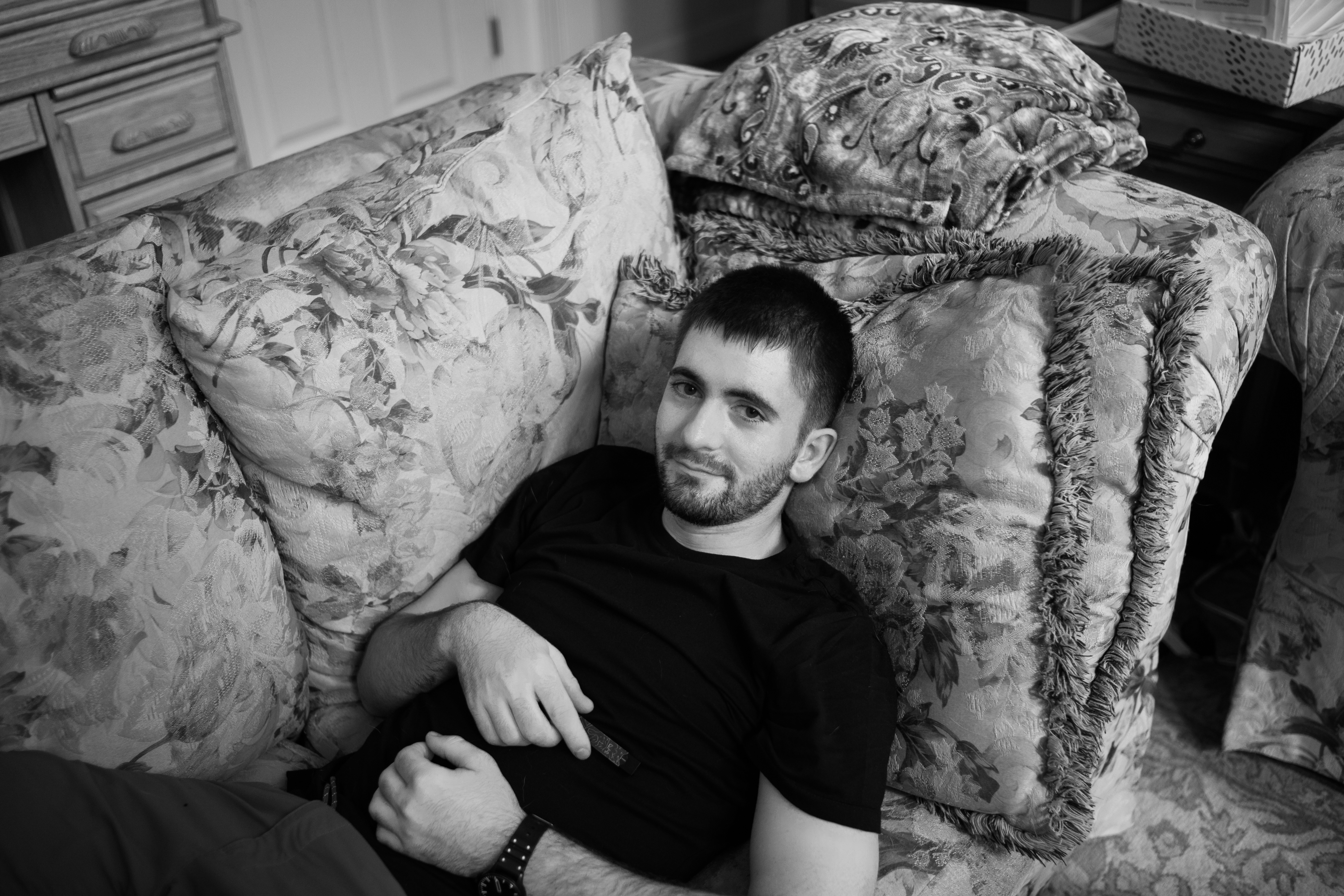 A young man reclines comfortably on a floral-patterned sofa, surrounded by plush pillows that add to the cozy atmosphere. The soft black-and-white tones create a relaxed mood, emphasizing a moment of tranquility and contemplation. His expression hints at contentment, capturing an intimate, casual moment in a familiar space.