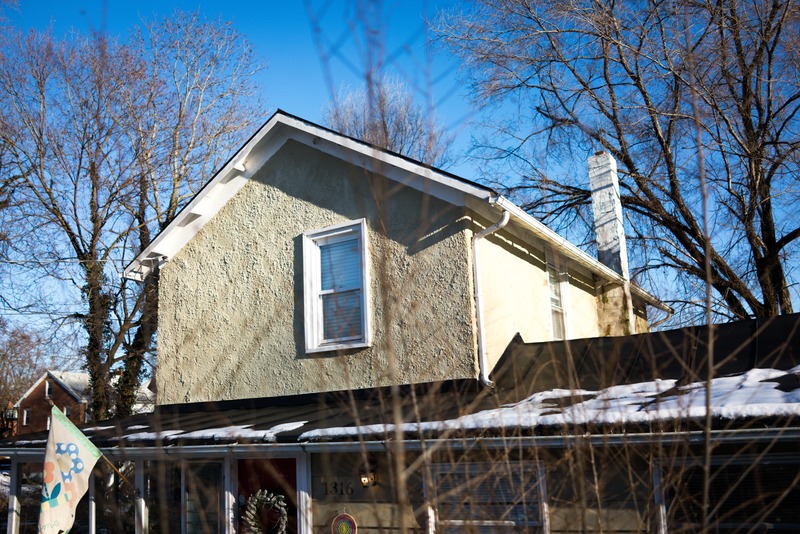 The photograph captures a quaint house adorned with a soft layer of snow, basking under a bright blue sky. The warm yellow exterior contrasts with the icy details, creating a cozy and inviting atmosphere. Leafless trees frame the scene, adding a touch of winter starkness against the home's warmth.