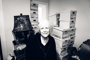 In a dimly lit room filled with towering boxes and clutter, a woman stands smiling softly, embodying warmth against the surrounding chaos. The contrasting light creates a cozy yet nostalgic mood, emphasizing her resilience and character amidst the disarray. The interplay of shadows and soft highlights draws the viewer's eye, making her the focal point of this intimate glimpse into a lived-in space.