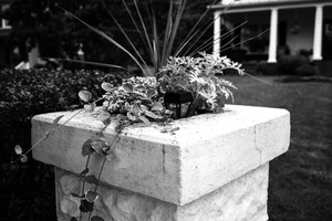 This photograph captures the serene beauty of a stone planter brimming with lush greenery, set against a soft-focus backdrop of a well-kept garden. The black-and-white treatment adds a timeless quality, emphasizing the textures of the stone and the delicate leaves, while the gentle play of light highlights the intricate details of the plants. The composition invites a sense of tranquility, suggesting a peaceful moment in an inviting outdoor setting.