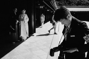 In this monochromatic scene, a photographer deeply focused on his camera captures a moment while elegantly dressed figures engage in conversation nearby. The stark lighting creates dramatic shadows, enhancing the juxtaposition of traditional attire and modernity. The mood embodies a blend of anticipation and artistic introspection, inviting viewers to ponder the stories unfolding within this serene space.