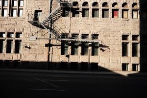 This photograph captures the textured facade of a stone building, dominated by a stark metal fire escape that adds a contrasting industrial element. The strong interplay of light and shadow creates a dramatic mood, emphasizing the architectural details and solitude of the empty street below. Warm sunlight accentuates the earthy tones of the stone while shadows add depth, conveying a sense of stillness in an urban environment.