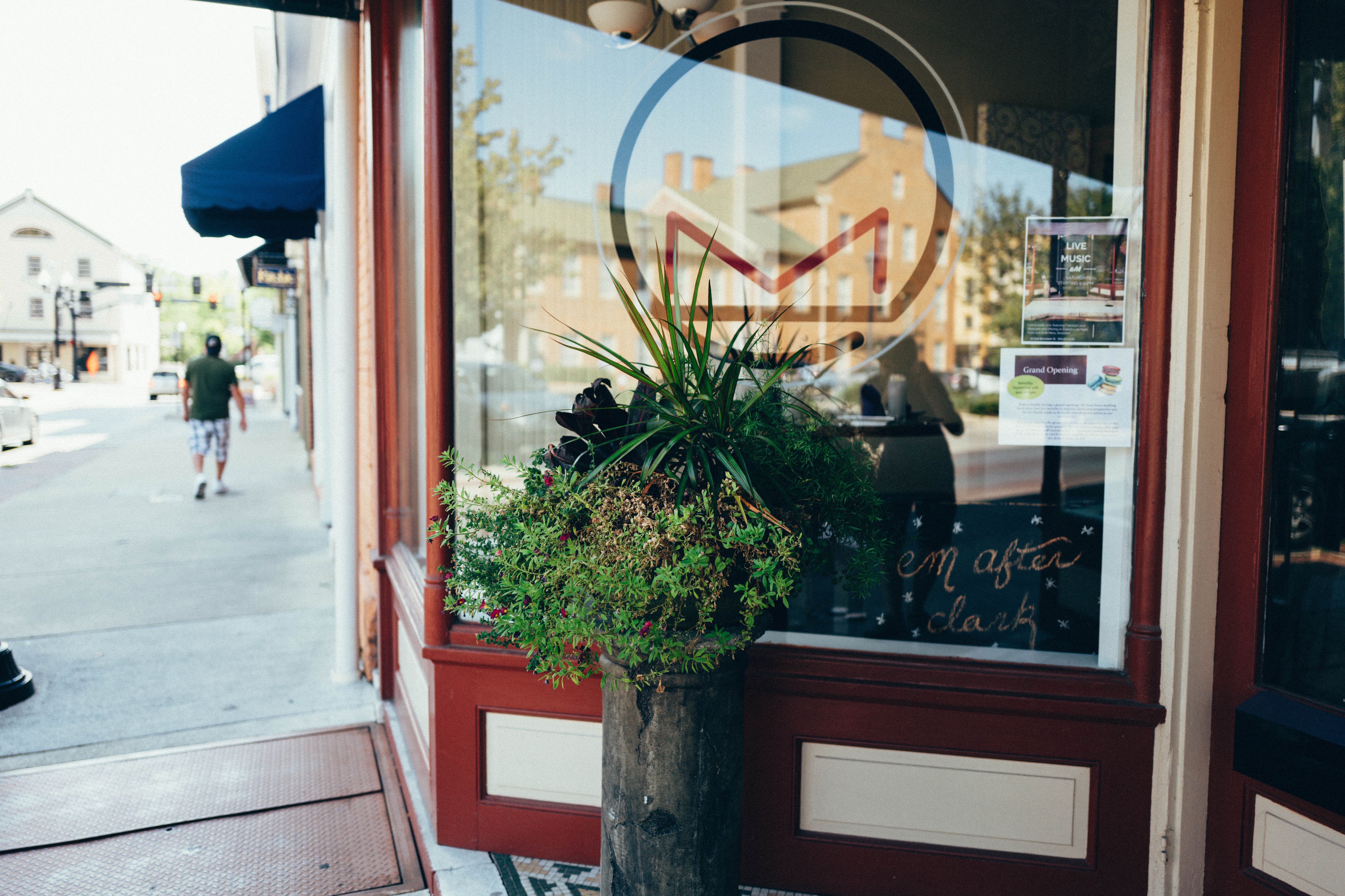 A charming street scene framed by a vibrant planter in front of a café. The composition captures a leisurely mood, as a lone figure strolls by, bathed in warm, natural light that highlights the town's inviting atmosphere. Reflections in the window add a layer of depth, connecting the interior warmth with the bustling outside world.