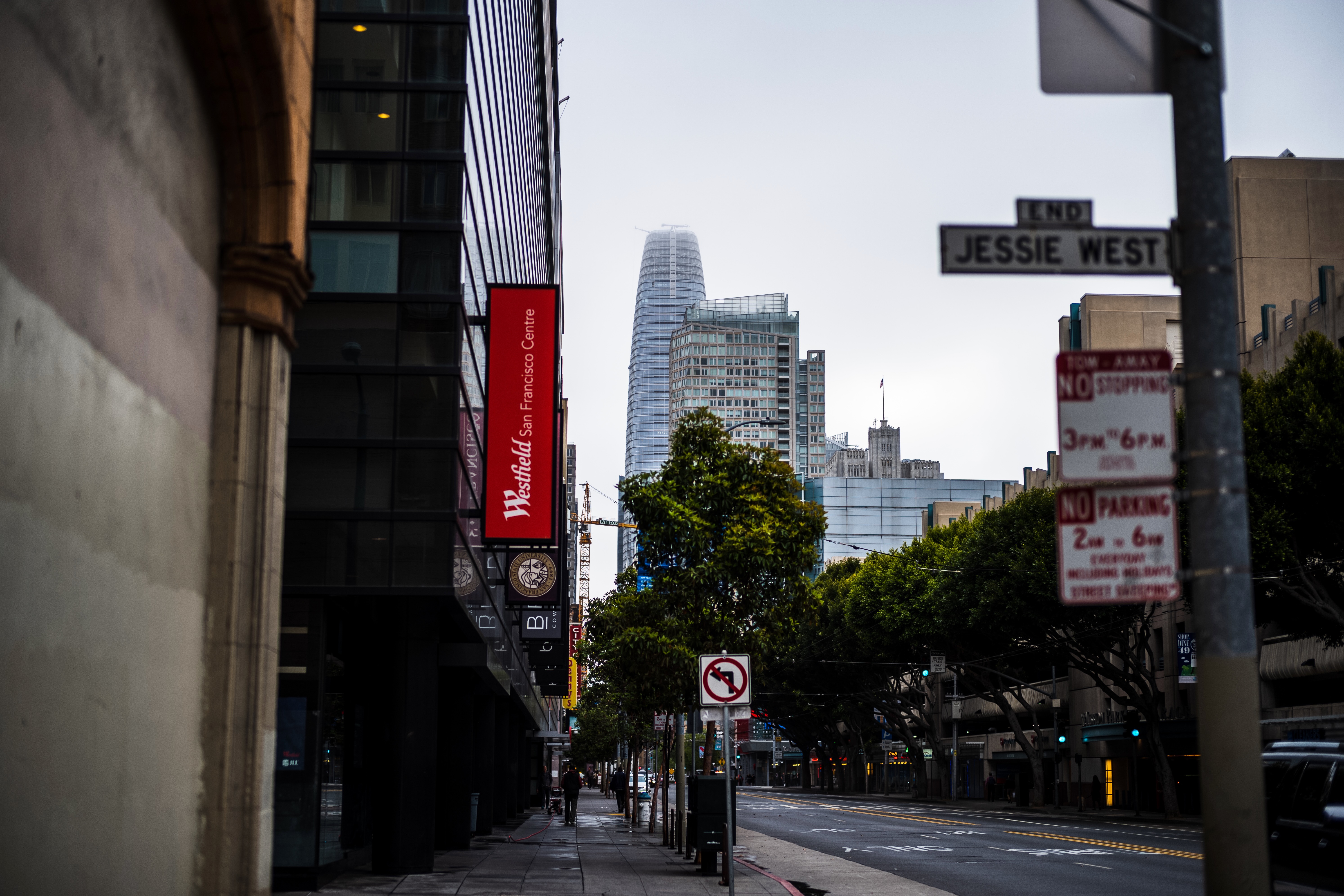 A quiet urban street captures the essence of a bustling city at rest. The soft, muted lighting of an overcast sky casts a gentle glow over the modern architecture, including the distinctive tower in the background. Street signs and greenery add an organic touch, juxtaposing the sleek lines of the cityscape with a hint of nature, creating a tranquil yet dynamic atmosphere.