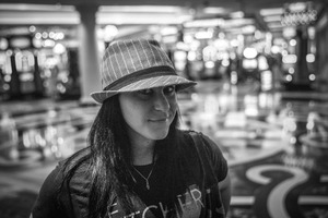 The photograph captures a woman standing in a bustling casino, her expression thoughtful and serene amidst the chaos. The black-and-white tones enhance the mood, contrasting her stylish hat against the blurred, vibrant backdrop of slot machines and lights. The composition draws the viewer in, emphasizing her presence in an otherwise frenetic environment.