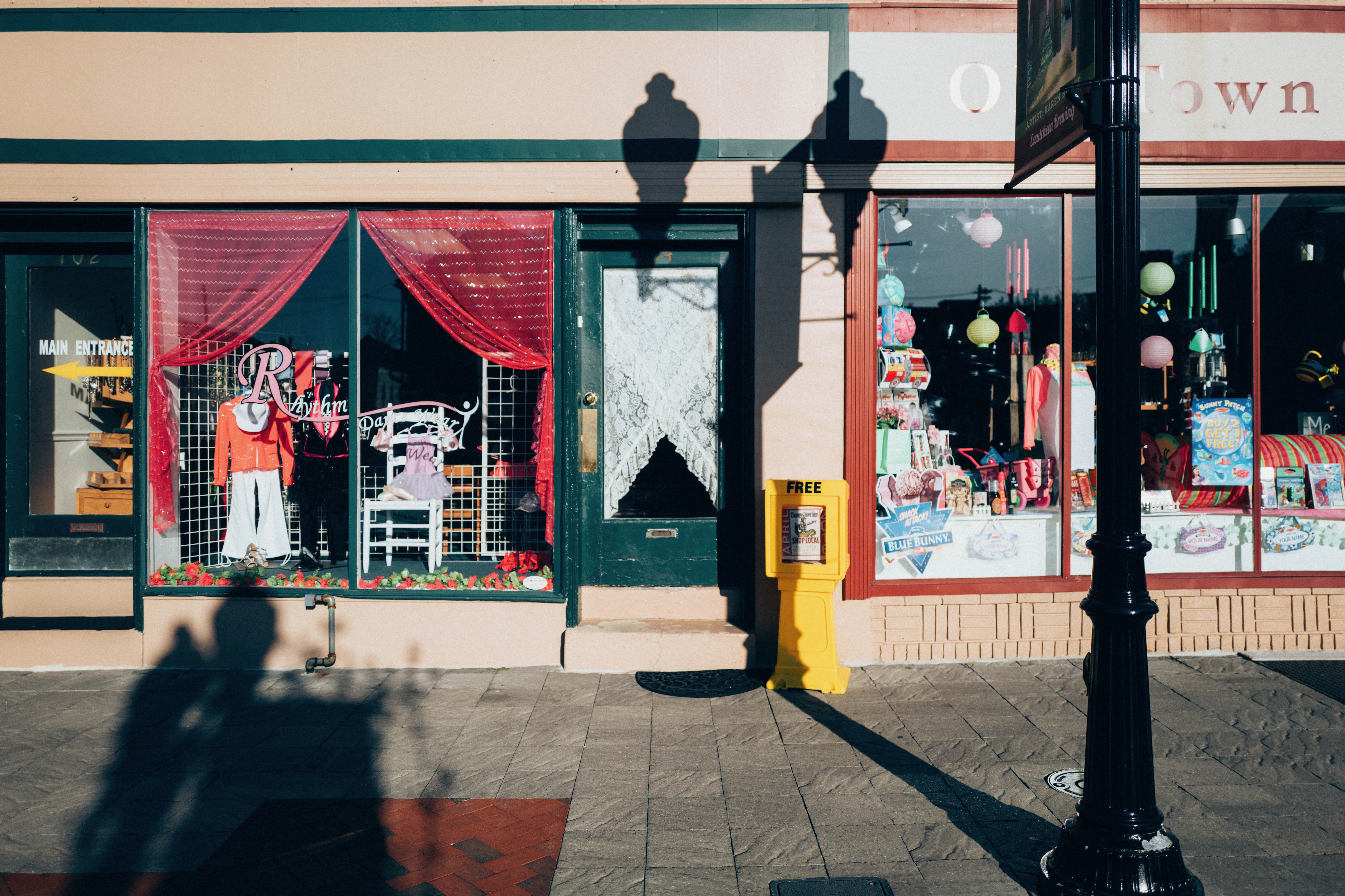 The photograph captures a quaint street scene showcasing two shop windows adorned with vibrant displays of clothing and colorful merchandise. Warm morning light casts playful shadows from a nearby lamp post, enhancing the inviting atmosphere of the storefronts. The contrasting textures and colors create a lively composition that invites curiosity and exploration.