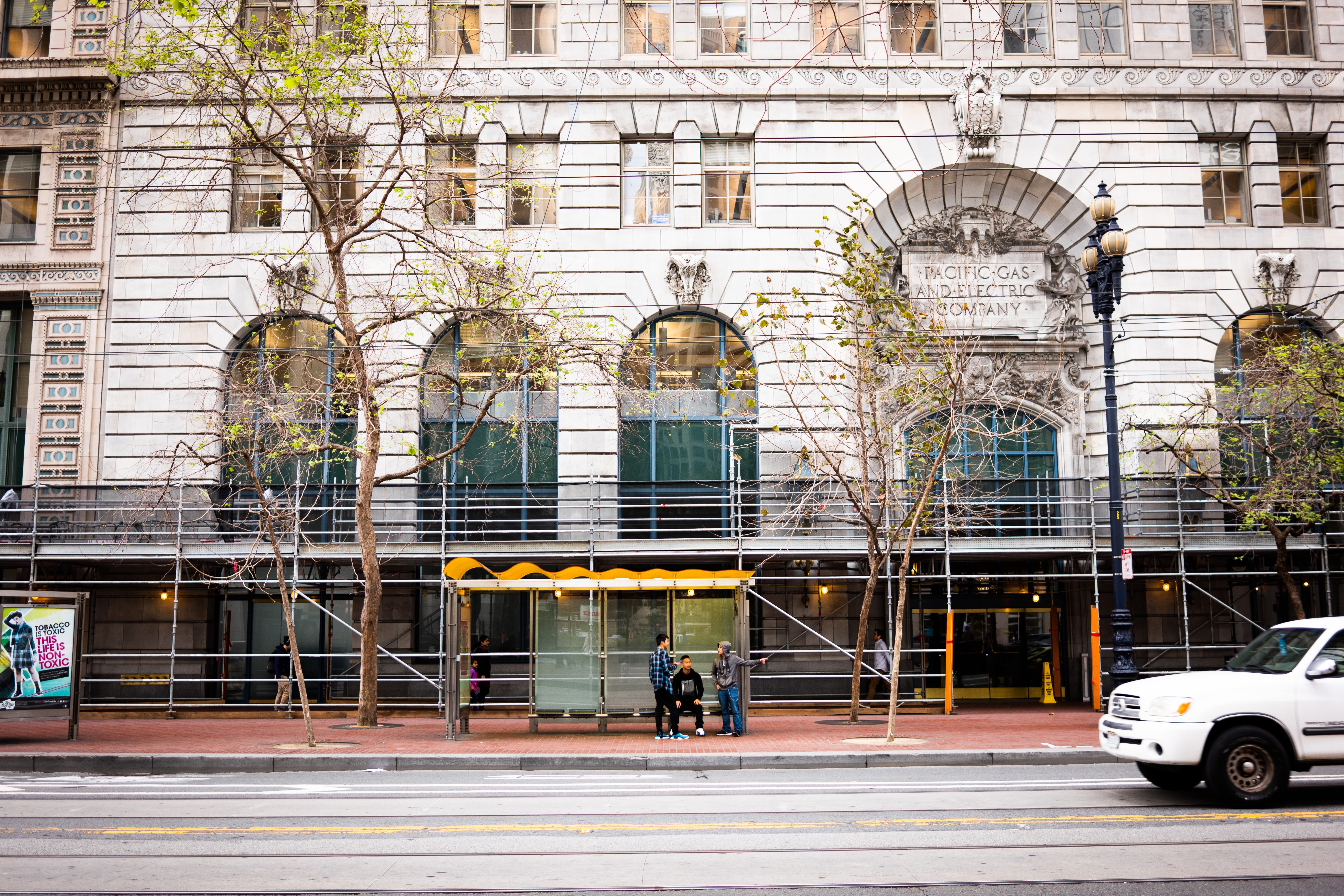 In this photograph, a historic building looms grandly over a pair of individuals seated at a bus stop, highlighting the juxtaposition of modern life against an architectural backdrop. The muted lighting and the bare branches of surrounding trees evoke a sense of transition, hinting at the changing seasons and the ongoing construction that frames the scene. The composition guides the viewer's eye to both the people and the ornate details of the building, framing a moment of pause amidst the urban hustle.