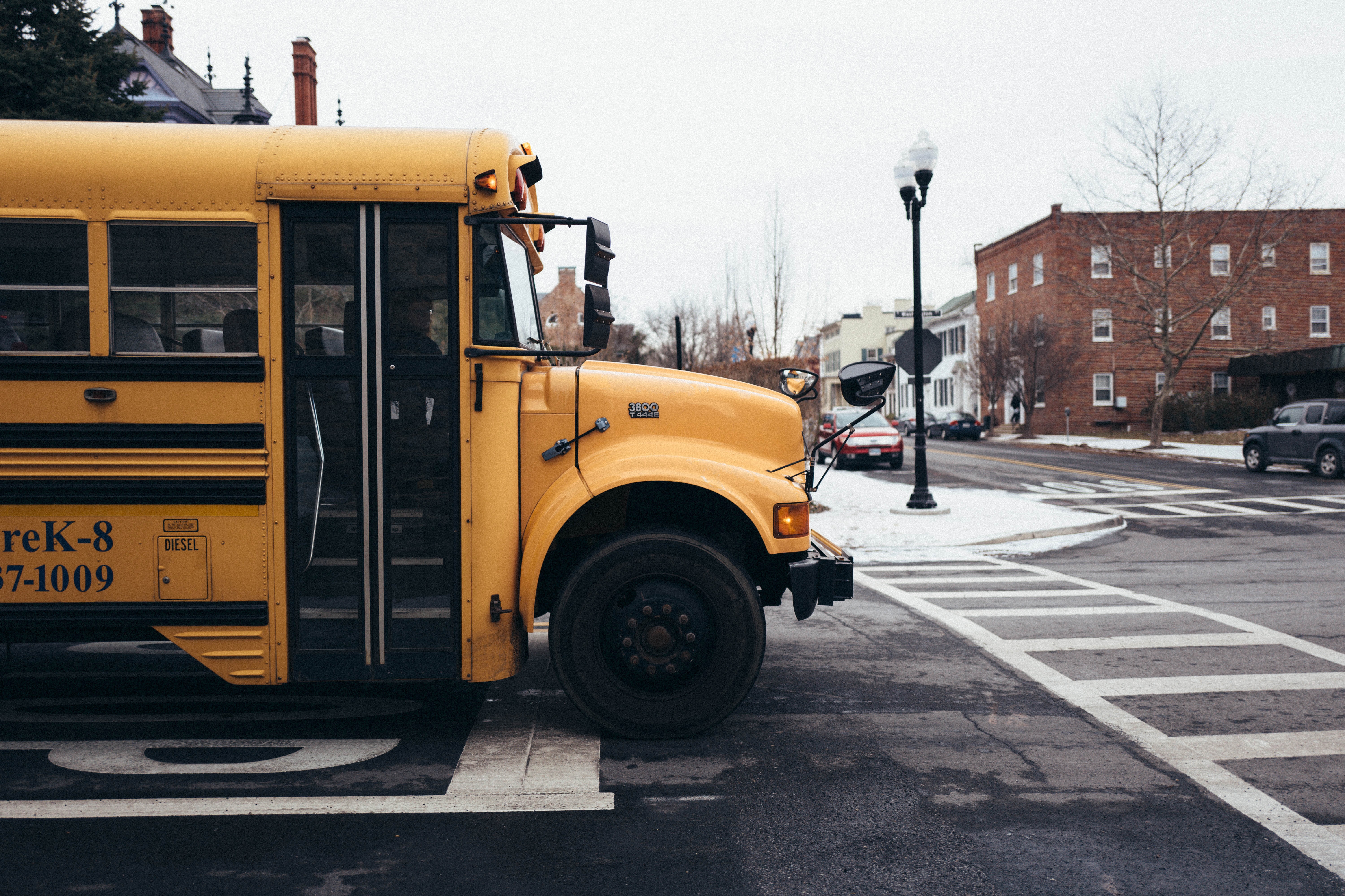 A stationary yellow school bus dominates the foreground, exuding a sense of nostalgia and everyday life. The muted winter light casts a somber yet tranquil mood, while the surrounding urban landscape hints at a quiet suburban neighborhood. The careful composition of lines and curves invites the viewer's eye to explore the scene, blending the bus with its environment.