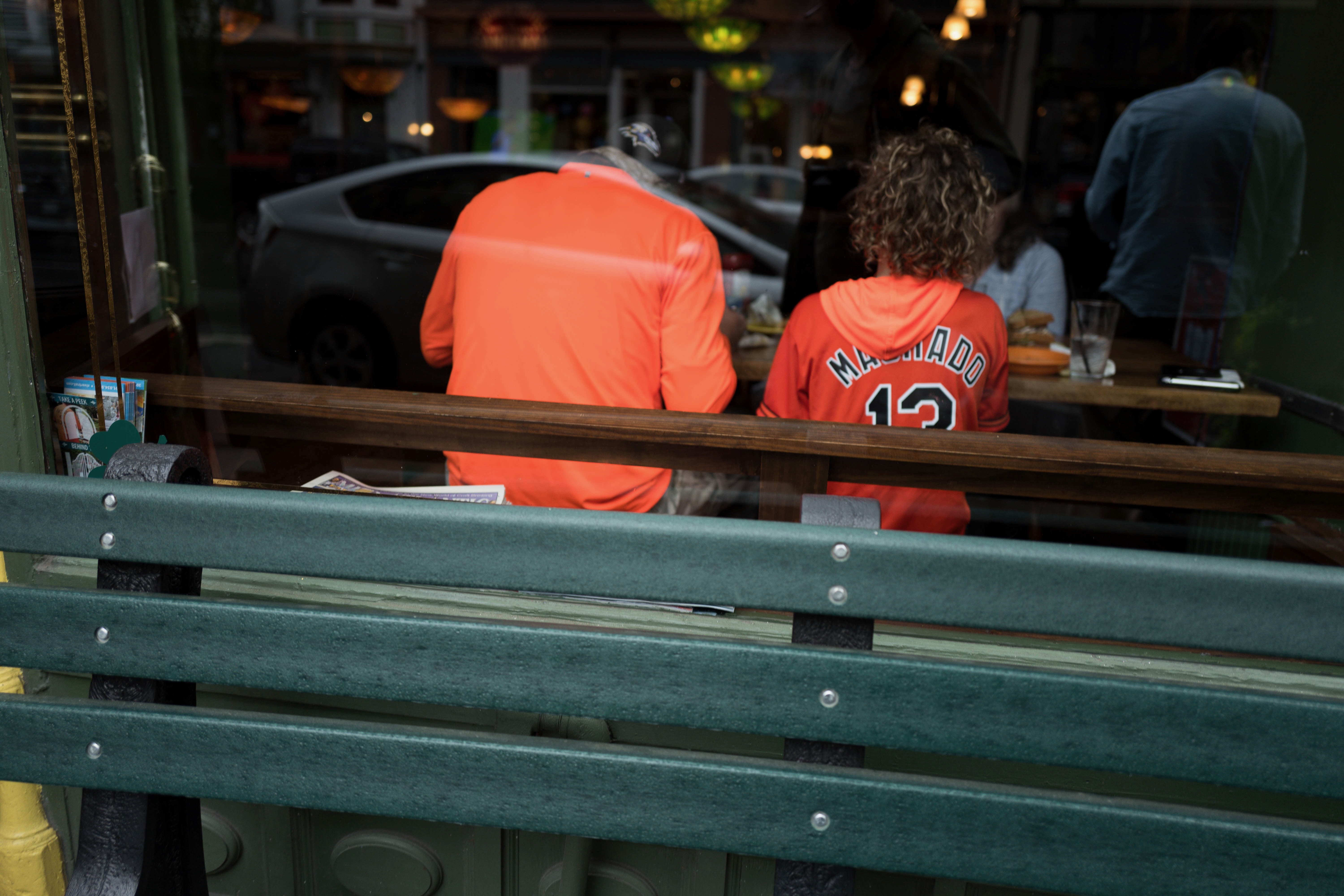 The photograph captures the backs of two individuals seated in a warm, inviting restaurant, their bright orange jerseys contrasting with the subdued interior. A green bench in the foreground adds depth and a sense of place, while the cozy light filters in, creating an intimate atmosphere. The mood is relaxed, hinting at a shared experience and camaraderie, even in silence.