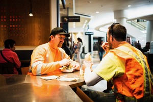 In a bustling food court, two construction workers engage in a focused conversation over their meals, illuminated by soft, ambient lighting. Their bright orange safety vests contrast with the neutral tones of the surrounding space, evoking a sense of camaraderie and everyday life. The background is lively yet slightly blurred, emphasizing their connection amidst the crowd.