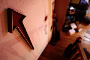 A bold, retro arrow sign leans against a textured wall, its rich red hue glowing softly in dim light. The composition draws the eye downward, suggesting an invitation to explore the space beyond. A glimpse of cluttered surroundings adds layers to the scene, evoking a sense of warmth and comfort intertwined with everyday life.
