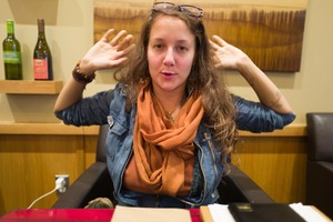 In a cozy café, a young woman playfully gestures with both hands raised, her expression exuding a mix of surprise and amusement. The warm tones of her scarf and the inviting wood panels in the background create a comfortable atmosphere, while soft lighting highlights her natural beauty. Bottles on the shelf add an intriguing touch to the composition, enhancing the relaxed yet vibrant mood of the scene.