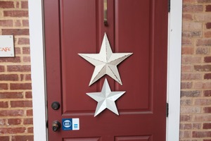 This photograph captures two decorative stars hung on a rich burgundy door, creating a charming and inviting focal point. The textured white star contrasts beautifully with the sleek, modern design of the bottom star, suggesting a blend of tradition and contemporary style. Warm, natural lighting enhances the inviting mood, complementing the rustic brick backdrop that adds a cozy depth to the composition.