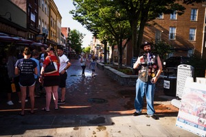 In a lively street scene, a man in a vest adorned with patches stands confidently while a group of people gathers nearby, engaged in conversation. The warm sunlight casts inviting shadows, highlighting the eclectic mix of individuals and the bustling atmosphere. With glistening wet pavement reflecting the surroundings, the mood is cheerful and vibrant, showcasing a moment of community connection.
