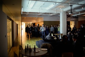 In a modern, softly-lit space, a group of people stands attentive, focusing on a speaker in a casual yet professional gathering. The warm wood tones reflect a cozy atmosphere, while the blurred figures in the foreground suggest a relaxed but engaged audience. The composition captures a blend of social interaction and professional discourse, evoking a sense of curiosity and camaraderie among the attendees.