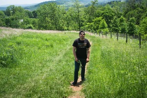A young man stands confidently in the lush, green meadow, holding a sprig of plant life in his hand. The bright sunlight casts a warm glow on the scene, enhancing the vibrant greens and creating a sense of tranquility. With rolling hills in the background and a casual stance, the image evokes a feeling of peace and connection to nature.