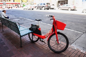 A bright red bike leans against a green bench in a bustling urban scene, capturing a moment of stillness amidst movement. The slightly angled composition leads the eye from the bike to the street, where cars and pedestrians create a lively backdrop. The natural light bathes the scene, adding a warm and inviting mood to the everyday city life.